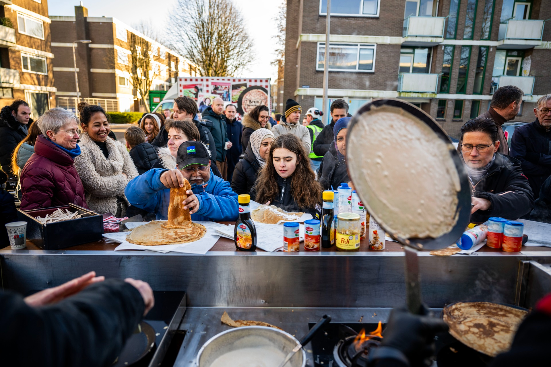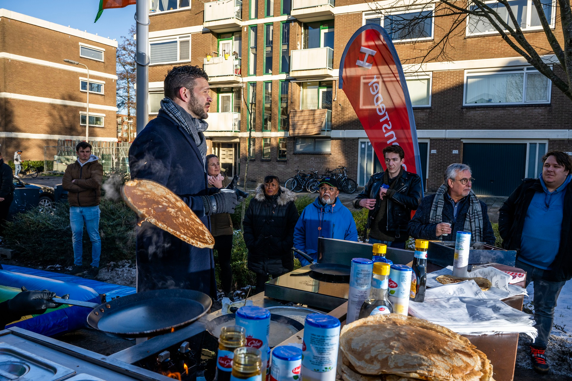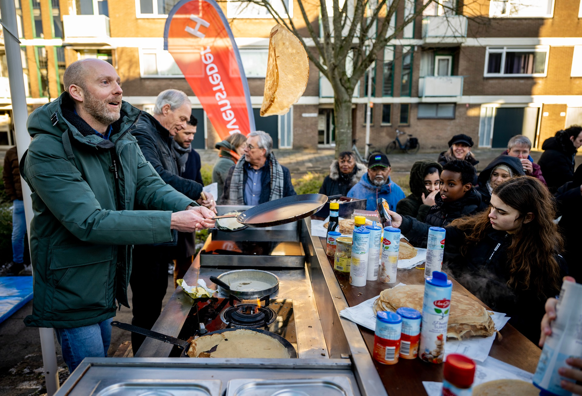 De sprekers toonden hun bakkunsten tijdens het pannenkoekenbakken op inductiekookplaat. Een ludieke start van het eerste verduurzamingproject in de Florabuurt Capelle! Bewoners konden alvast de kunst afkijken. Bij de verbeteraanpak maken zij ook de overstap naar elektrisch koken.